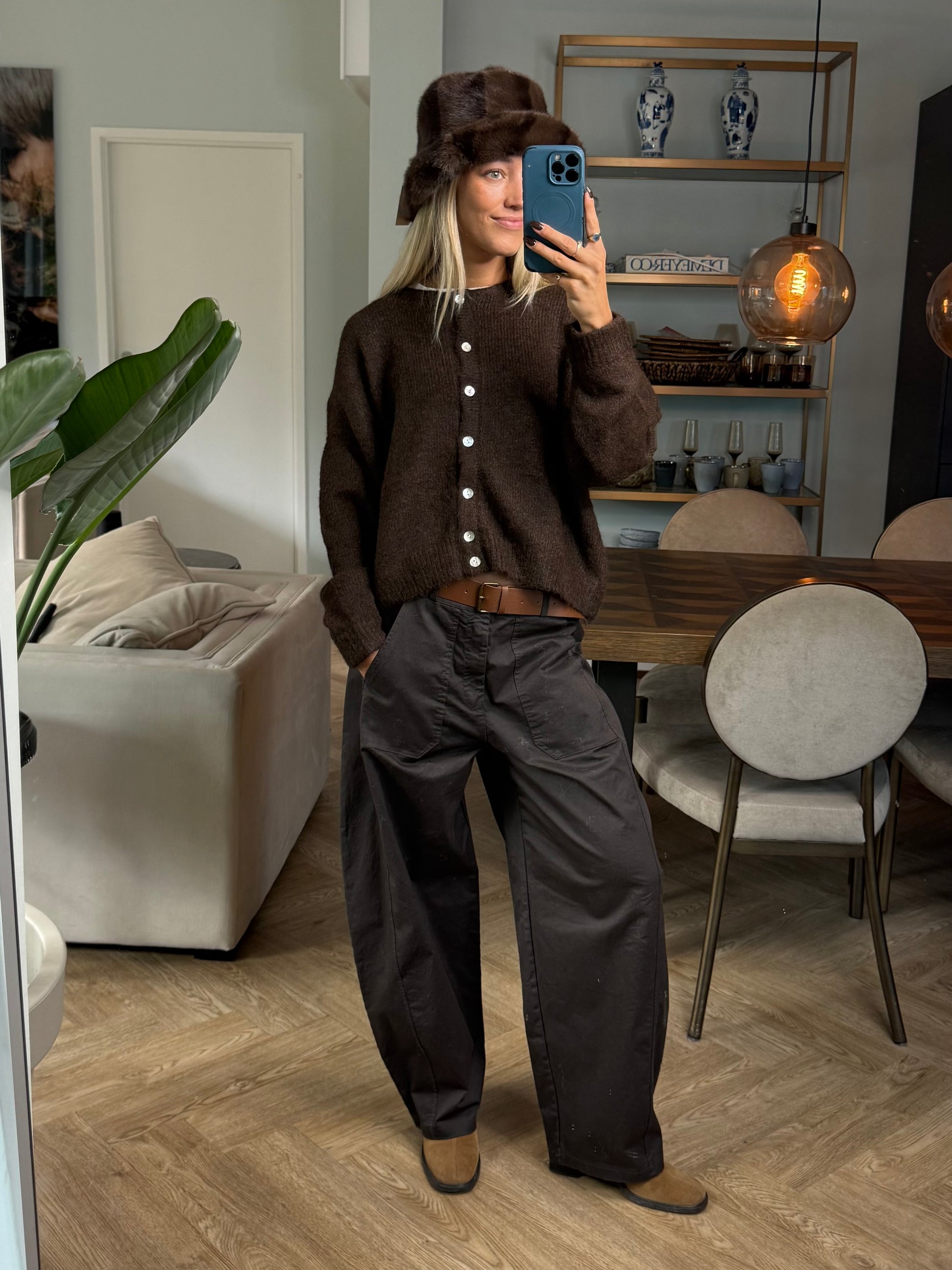 Dit heerlijk zachte bruine vestje met parelmoer knopen is in diverse kleuren verkrijgbaar en is one size.