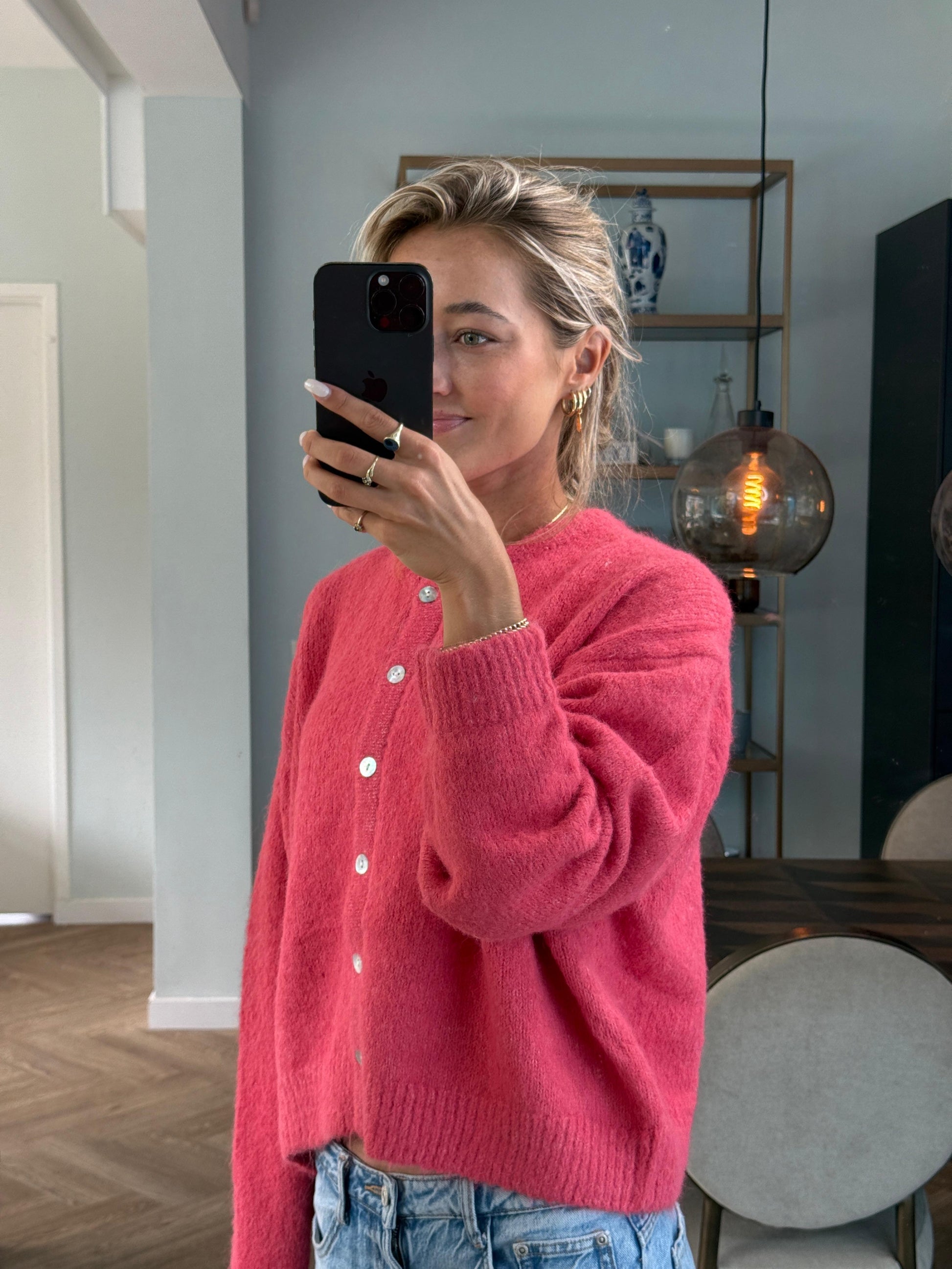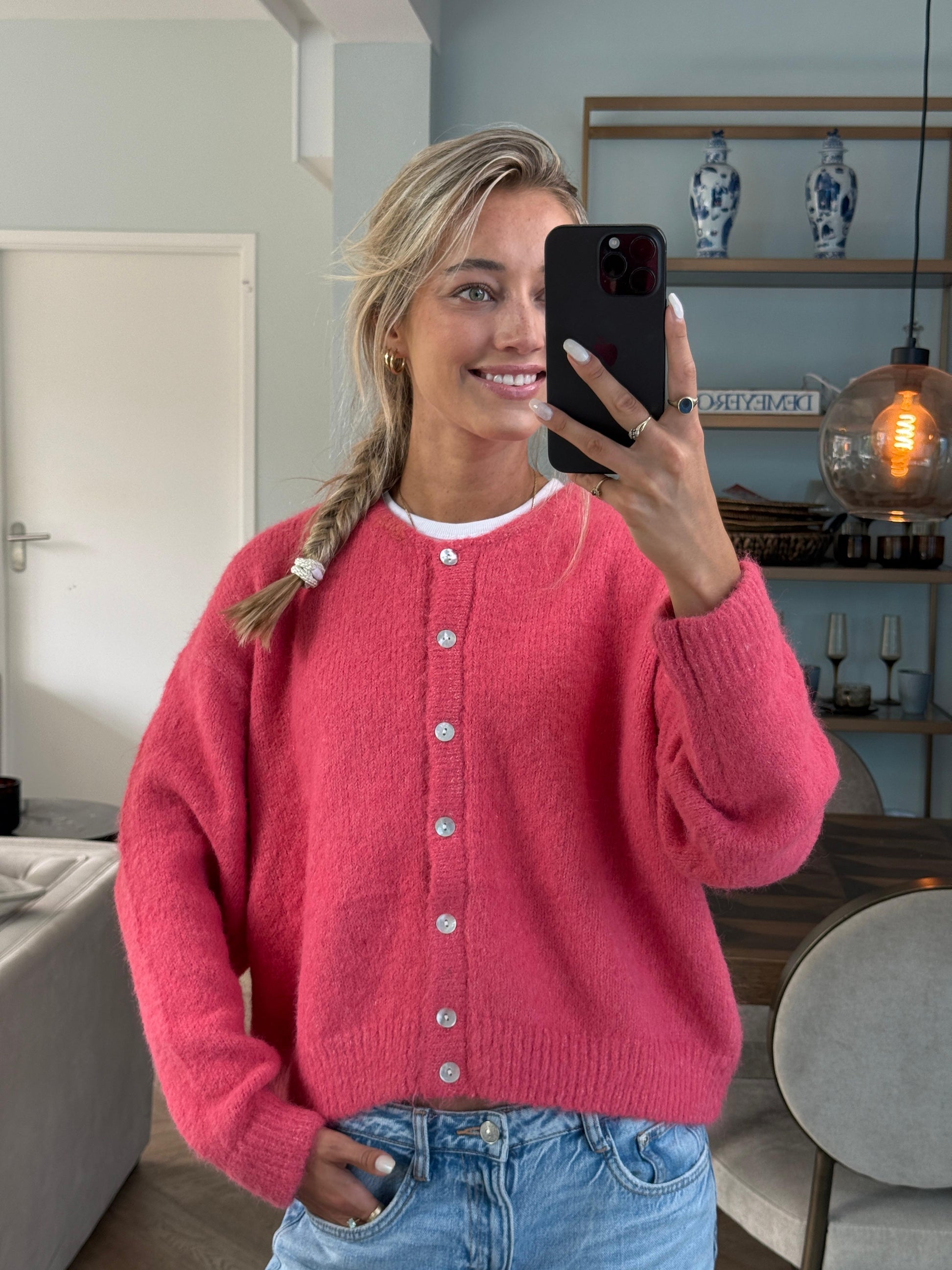 Dit heerlijke zachte framboos kleurige vest met parelmoer knopen is in meerdere kleuren en in 1 maat verkrijgbaar.