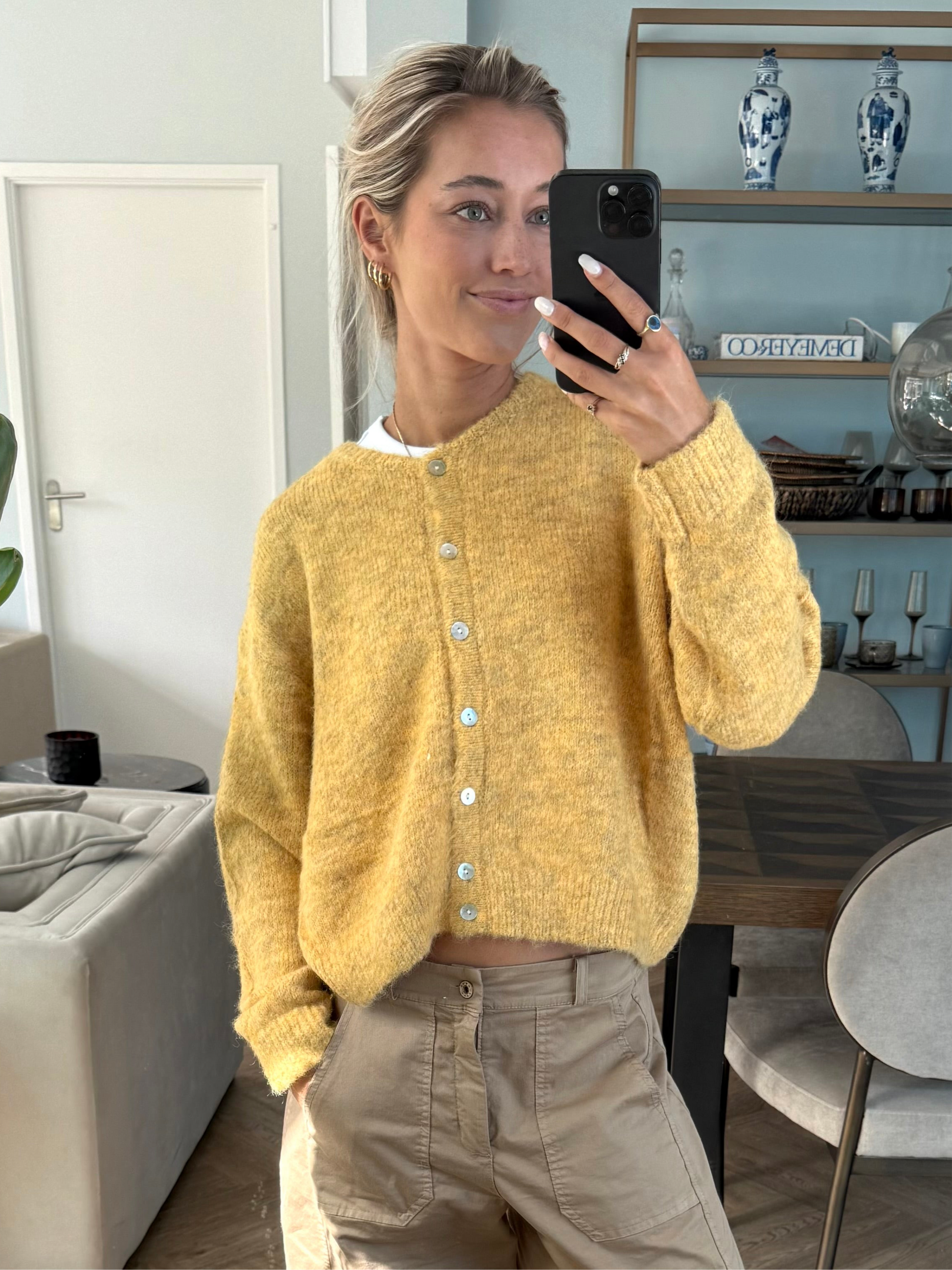 Deze prachtige okergele vest met lange mouwen is in heel veel kleuren en in 1 maat verkrijgbaar .