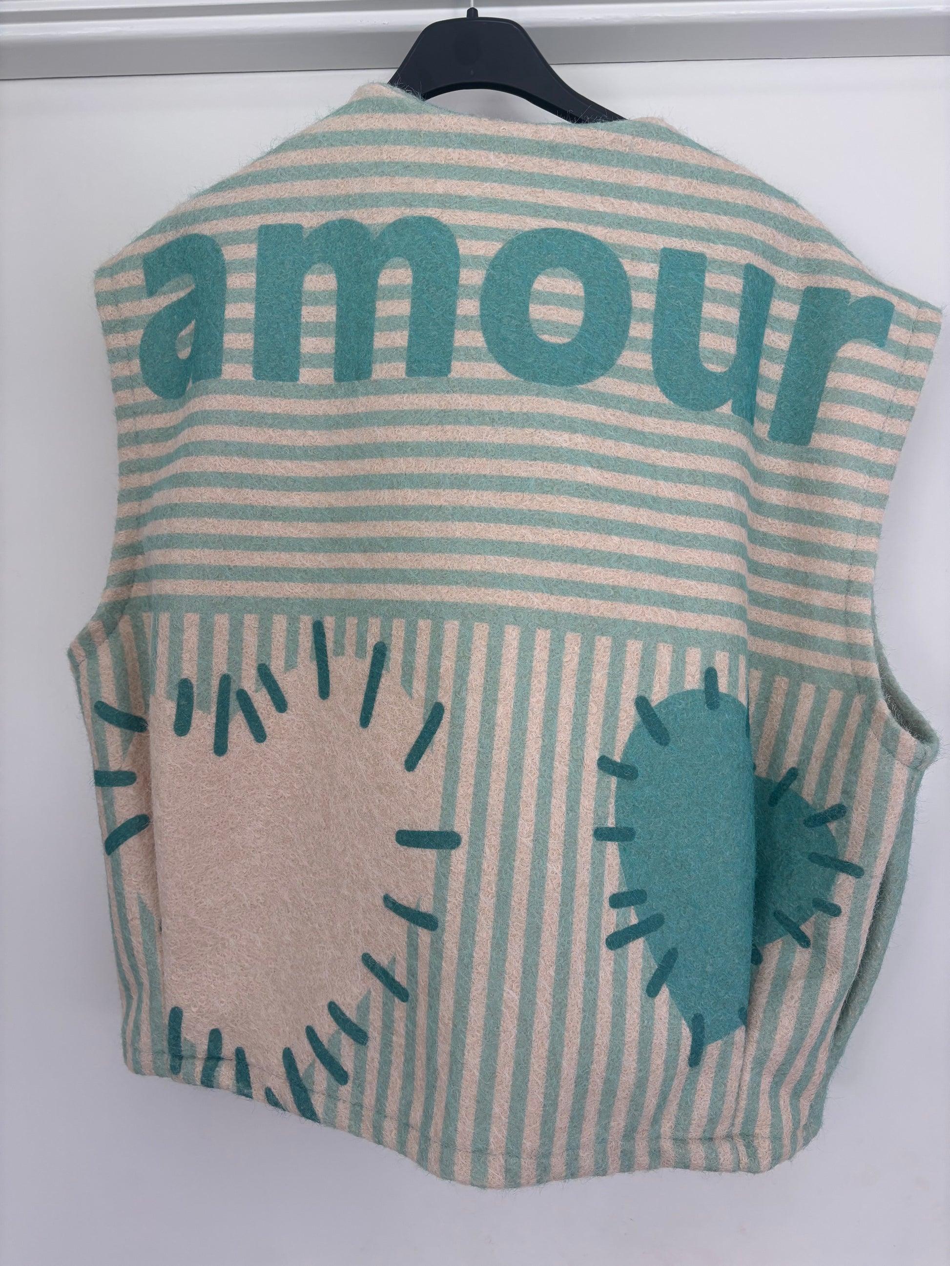 Speels gilet met frisse uitstraling, is de perfecte toevoeging aan je outfit, aan de achterkant tekst Amour in de zachte mint groene kleur. In 1 maat verkrijgbaar.