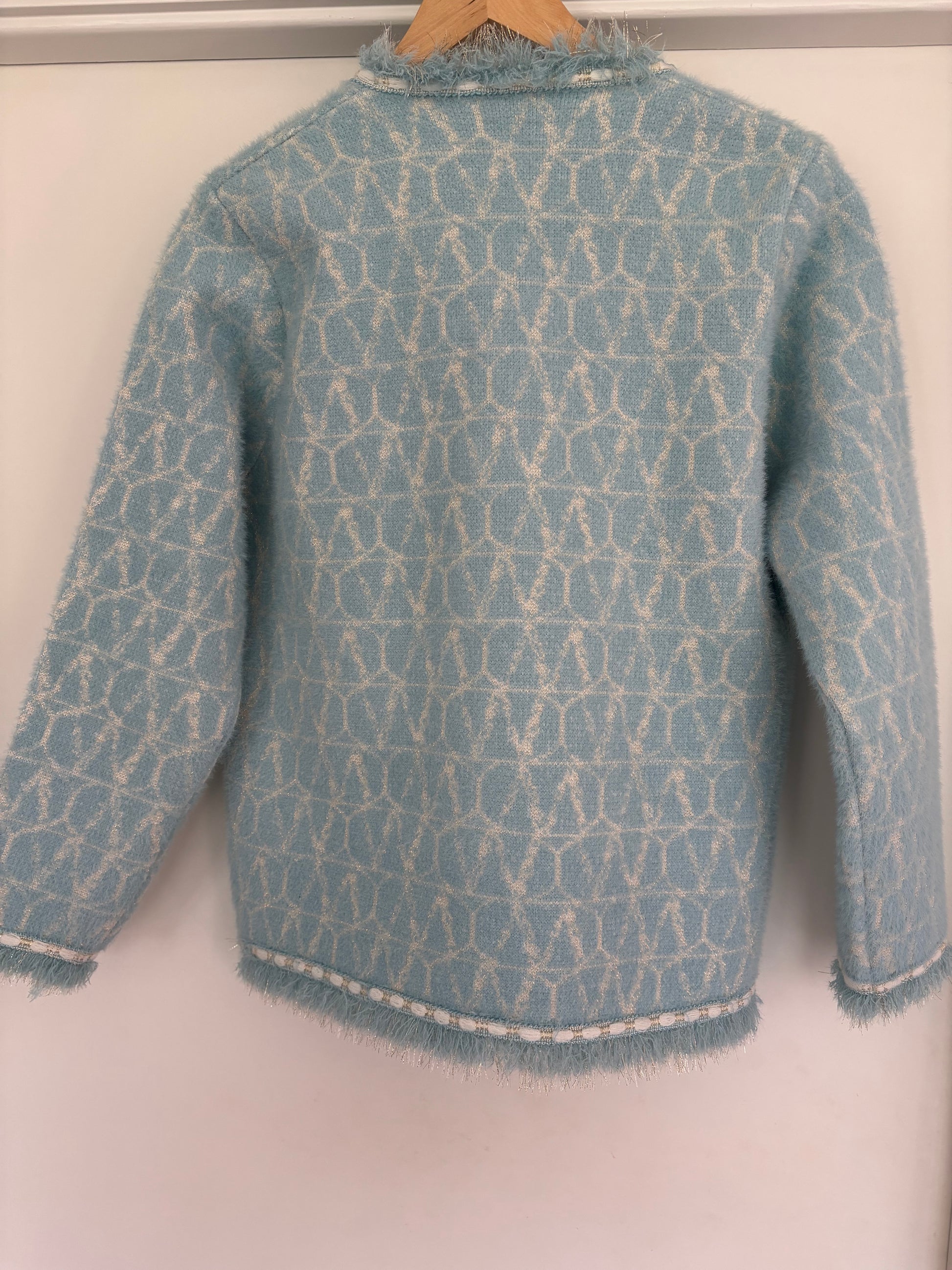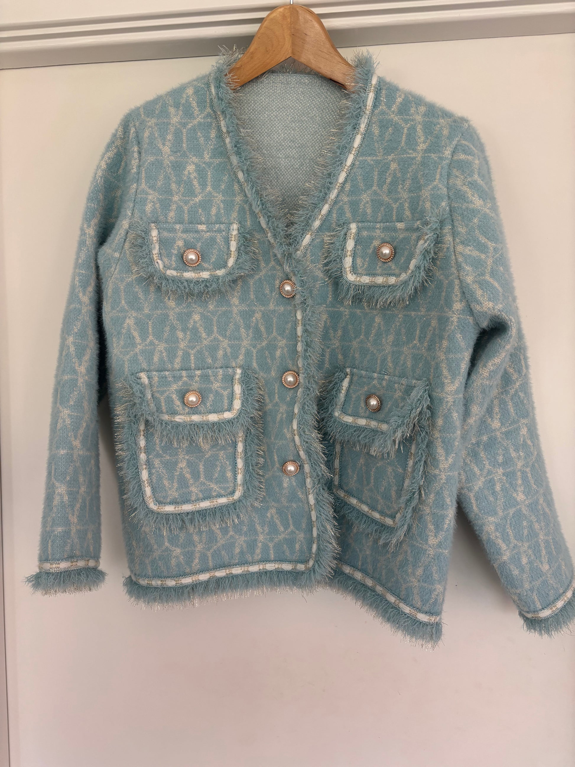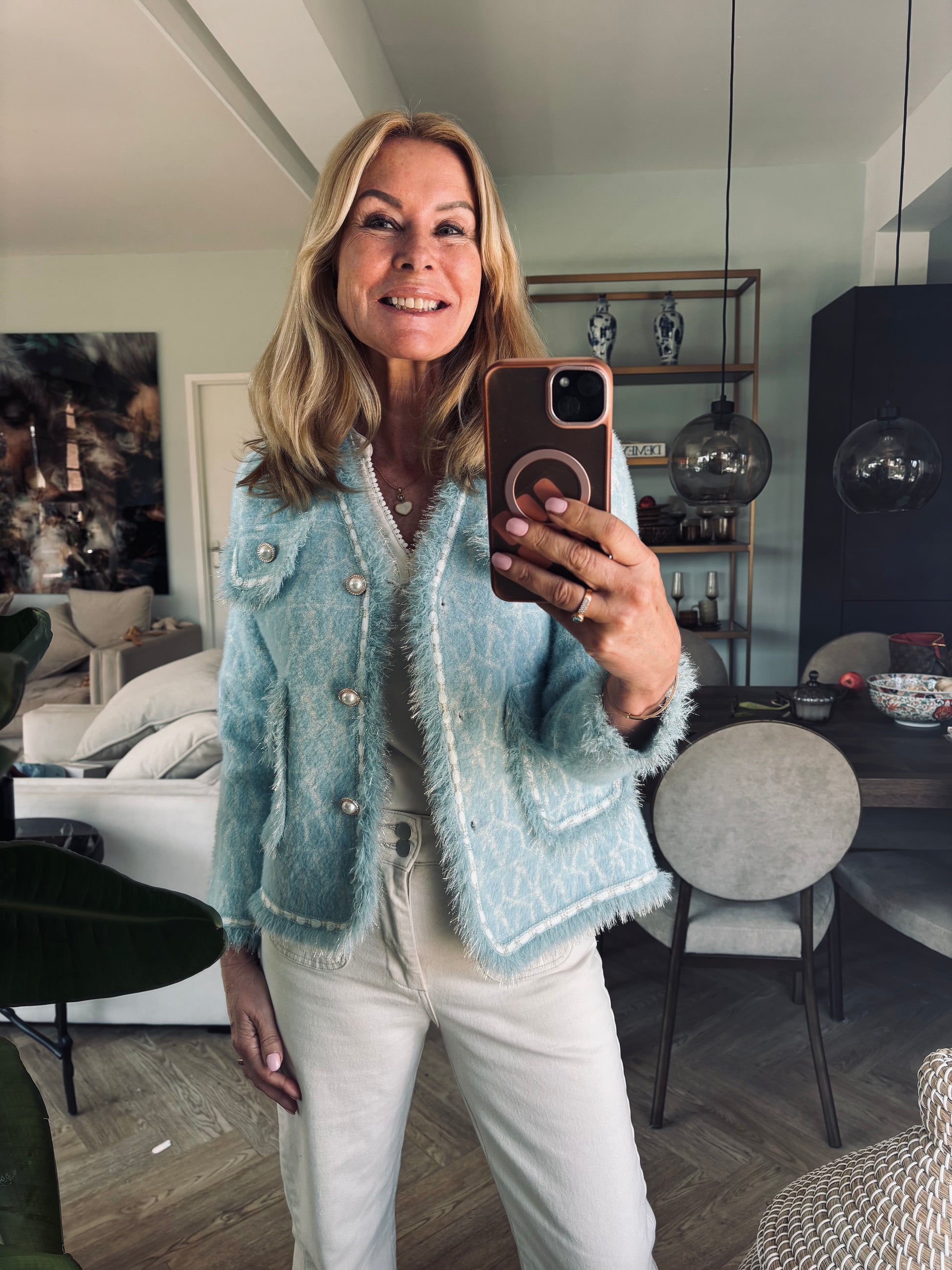 Lichtblauw stijlvol jasje met parelknopen te contobineren op ecru , jeans pantalon of rok. Het jasje is in 1 maat verkrijgbaar, model heeft maat 36/38