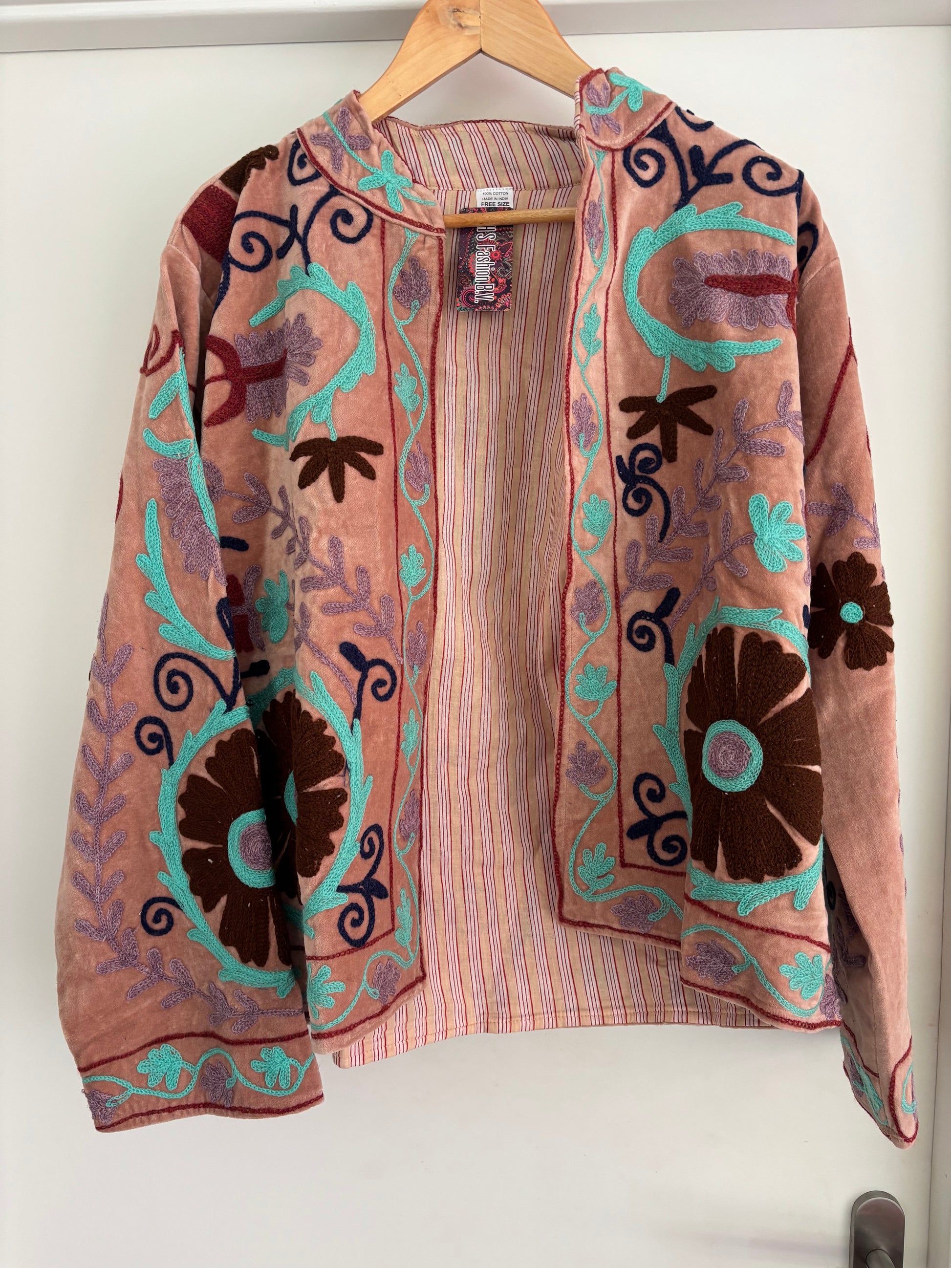 Dit prachtige fluwelen jasje is gevoerd met katoen en heeft een mooie bloem print en is in 1 maat verkrijgbaar.