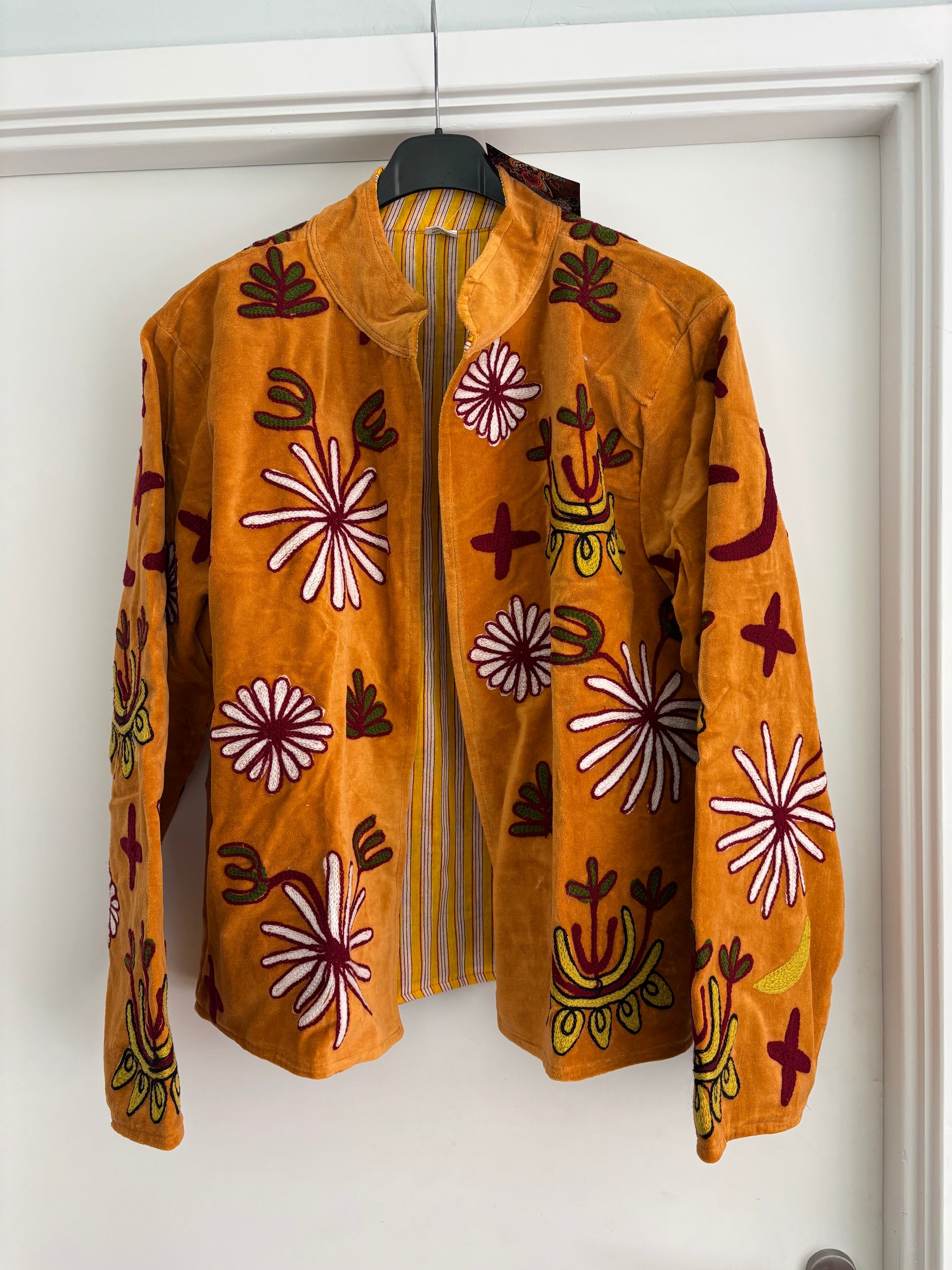 Dit prachtige oker kleurige jasje is in diverse kleuren en in 1 maat verkrijgbaar en heeft een katoenen voering.