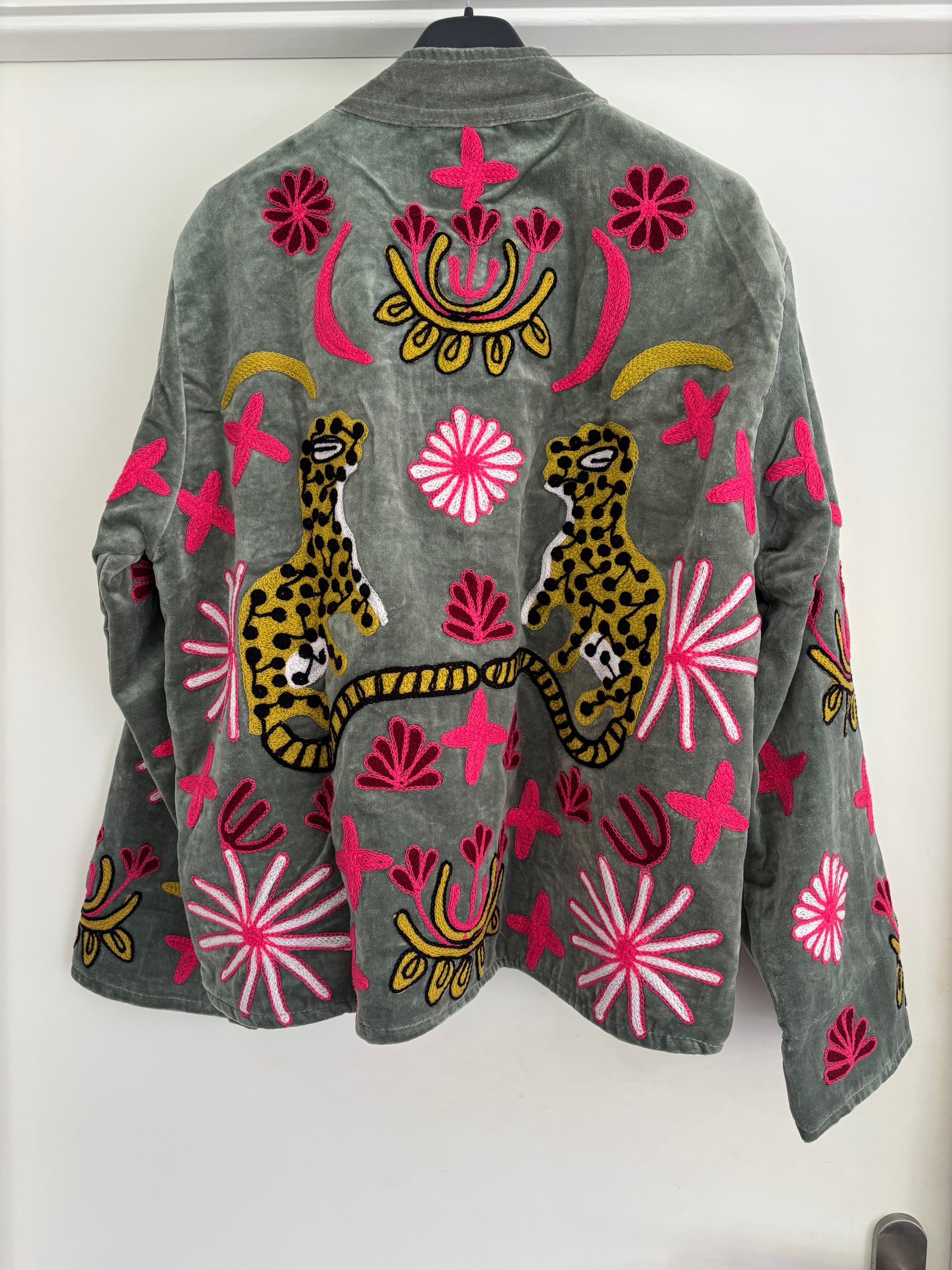 Dit prachtige zacht groene handgemaakte jasje met tijger is in diverse kleuren verkrijgbaar en in 1 maat.