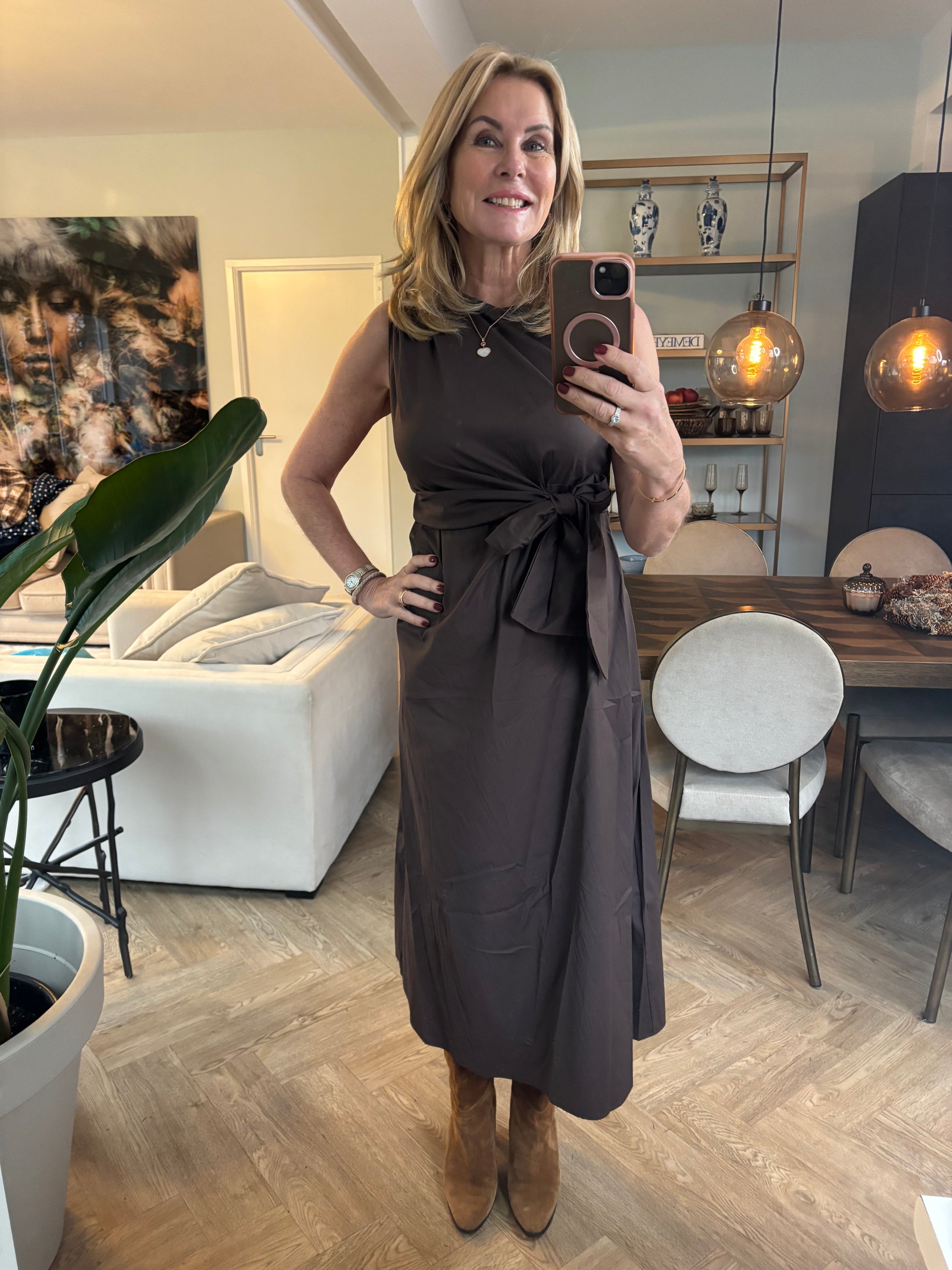 Hoe feestelijk is deze chocolade bruine jurk met strik , de jurk is 1 maat en valt als s/m . Leuk met laarzen, pumps of flatjes .