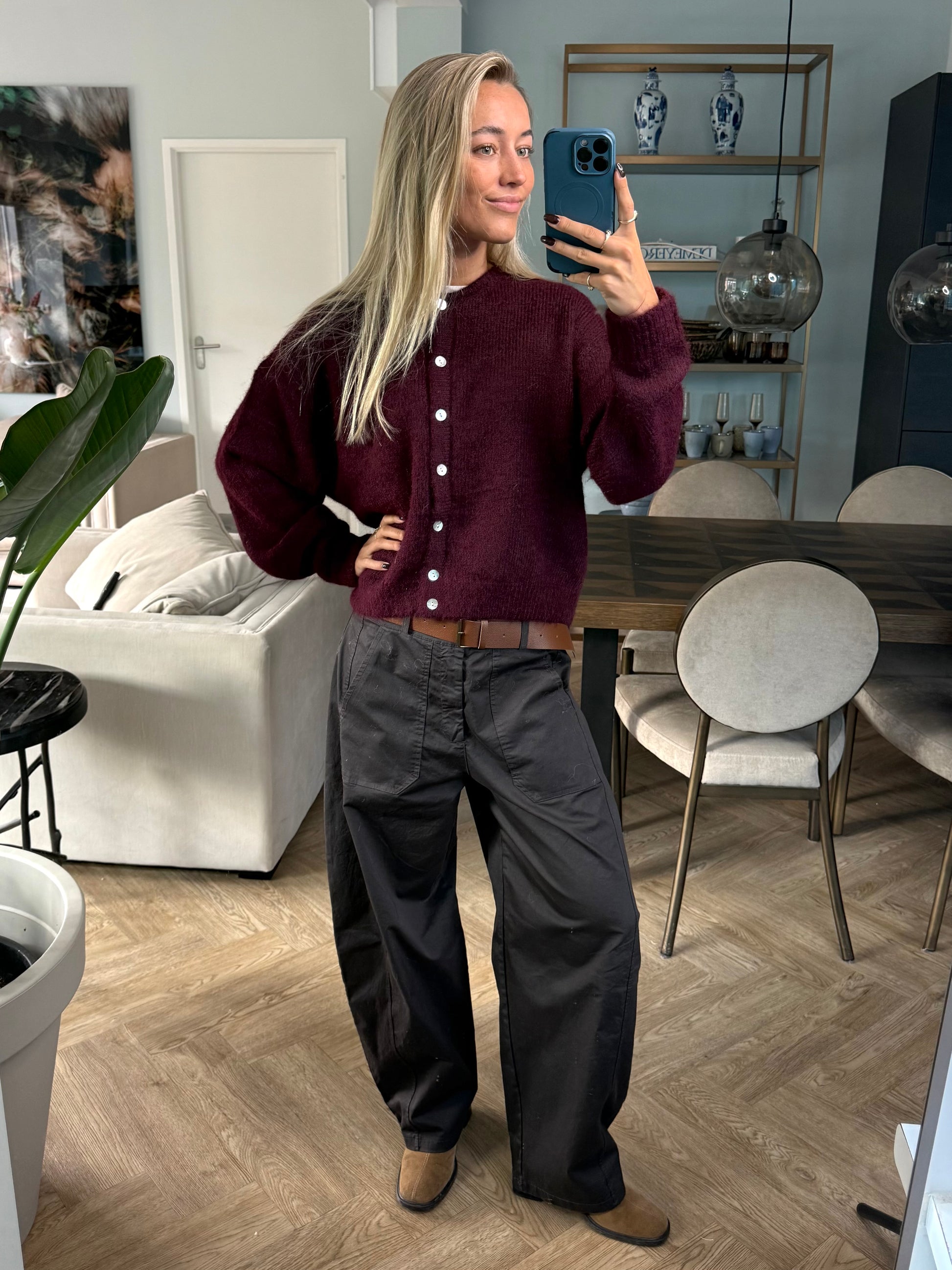 Dit heerlijk zachte rode vestje met parelmoer knopen is in meerdere kleuren verkrijgbaar en is one size.