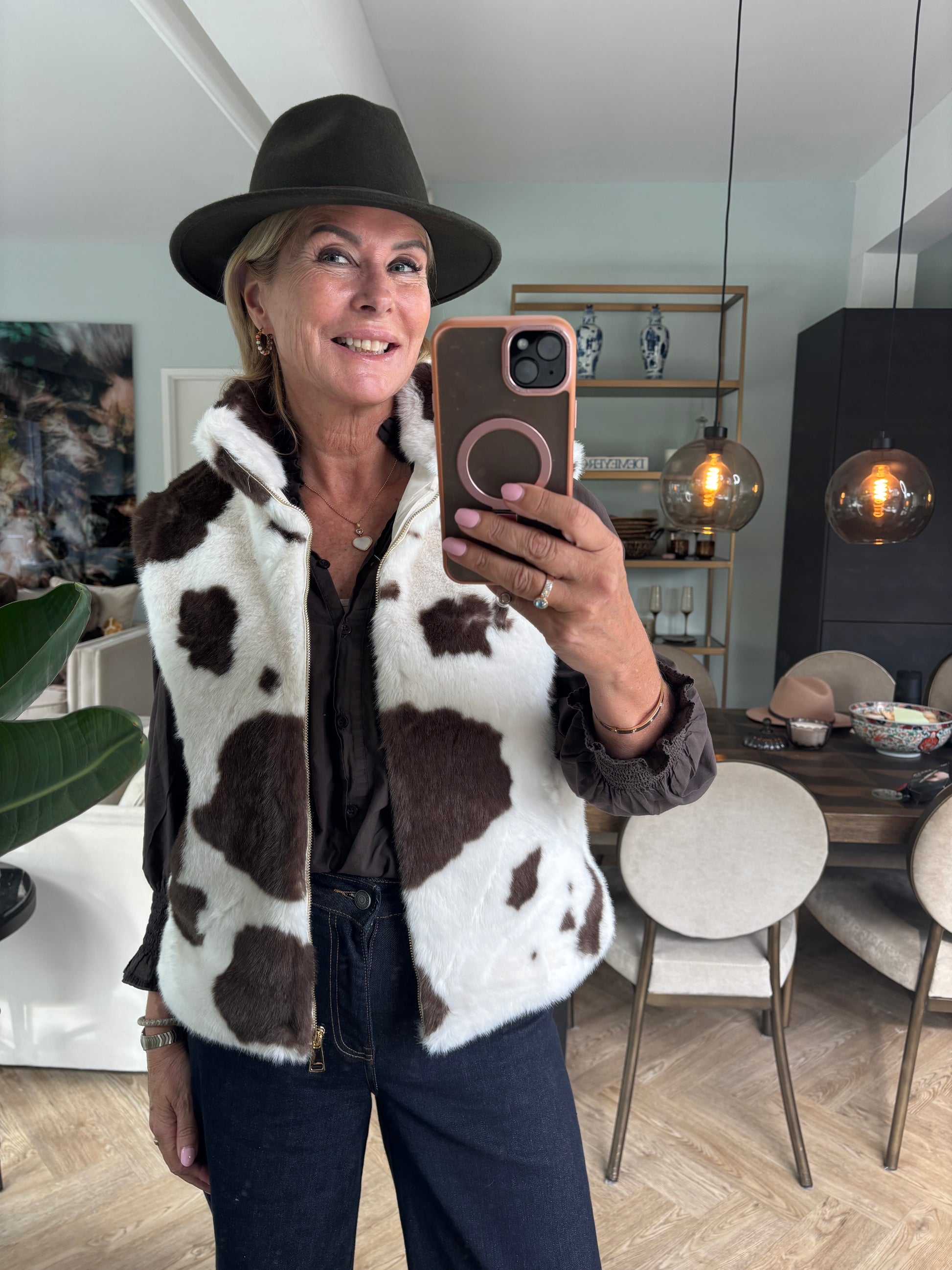 Deze eyecatcher bodywarmer koeienprint zit heerlijk warm in dr kleur ecru/bruin en is in 1 maat verkrijgbaar.