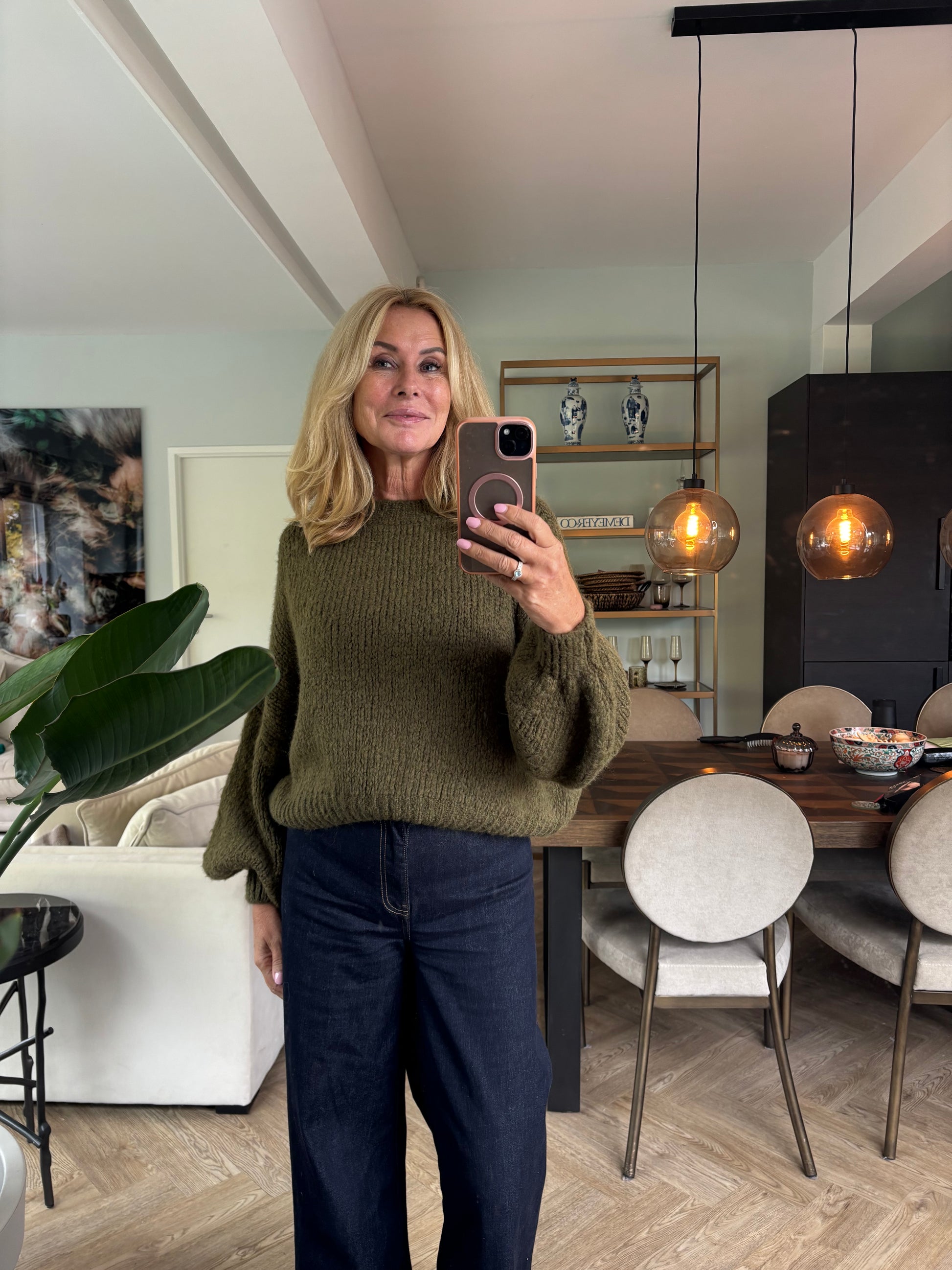Deze donker khaki kleurige trui is in diverse kleuren verkrijgbaar en in 1 maat.